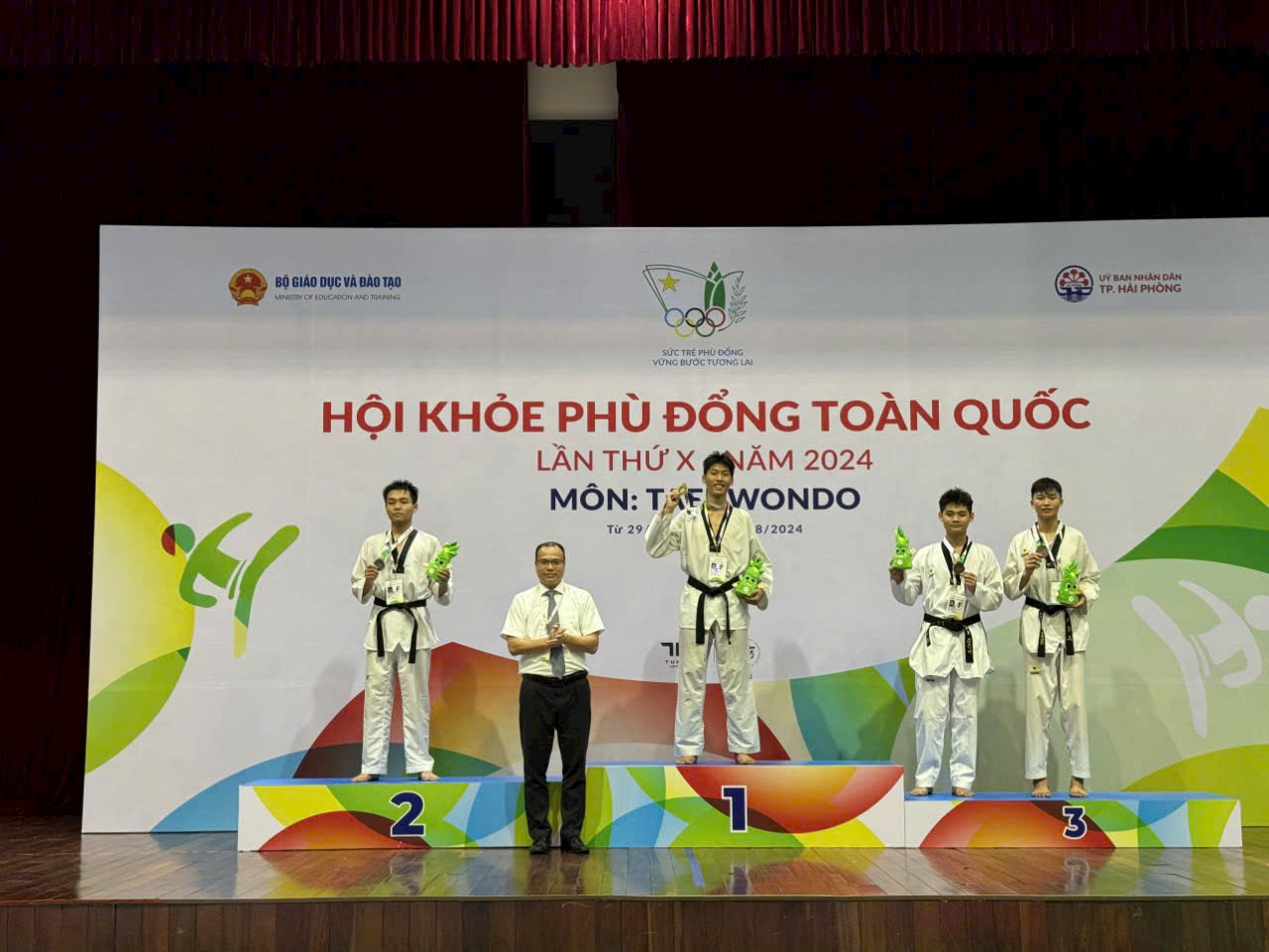 Tối qua 29/7/2024 tại nhà thi đấu trường Đại học Hàng Hải Việt Nam, nơi tổ chức thi đấu môn Taekwondo trong chương trình Hội khỏe Phù Đổng toàn quốc lần thứ X, các vận động viên môn Taekwondo thành phố đã xuất sắc dành được những tấm huy chương đầu tiên, góp thêm vào thành tích chung của Đoàn vận động viên Hải Phòng: